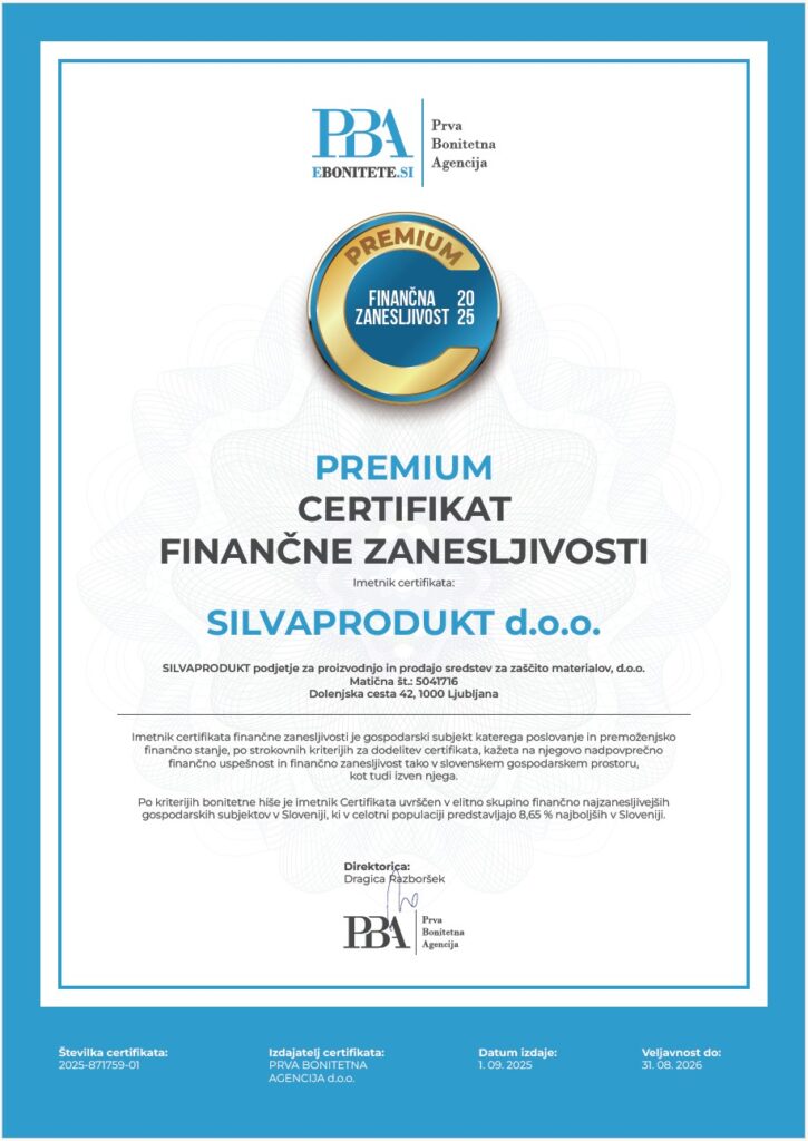 Mejnik, ki nas navdaja s ponosom » Certifikat finančne zanesljivosti« V vsakdanjem delu so trenutki, zaradi katerih se ustavimo – polni ponosa, hvaležnosti in veselja. Danes je ravno takšen trenutek. Dne 29. avgusta smo prejeli s strani družbe PRVE BONITETE AGENCIJE Certifikat finančne zanesljivosti, ki smo ga prislužili s predanostjo in delom. S tem