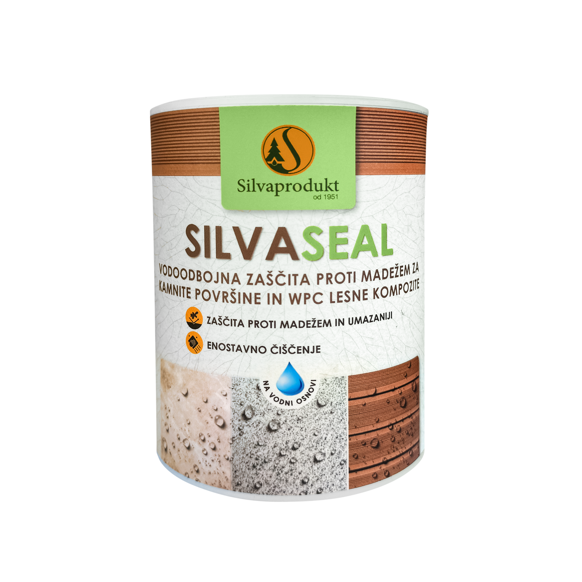 - Na kamnitih površinah in leseno-plastičnih kompozitih, ki so bili izpostavljeni vremenskim vplivom in biotskim faktorjem, priporočamo predhodno čiščenje s čistilom Silvaclean wood & stone. Pred nanašanjem premaza Silvaseal moramo očiščeno površino dobro sprati z vodo in presušiti.